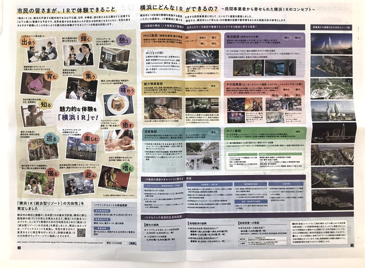 今日の朝刊に、広報よこはまの特別号が折り込まれています。横浜市が目指すイノベーションIR(統合型リゾート)について、現状の進捗などが紹介されています。中には事業者から提案されたイメージ図も掲載されており視覚的に理解を頂けると思います。