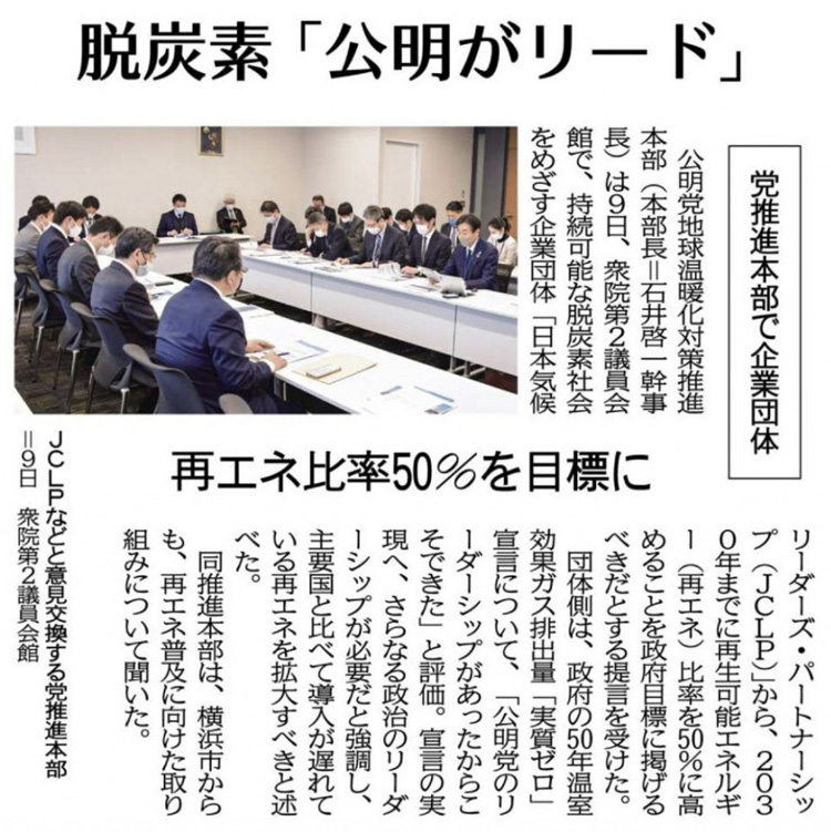 今日の公明新聞には、国会で開催された「公明党地球温暖化対策推進本部会議」の様子が掲載されていますが、横浜市も基礎自治体の代表として、カーボンニュートラルに向けた取り組みについての発表を行ったとの事です。