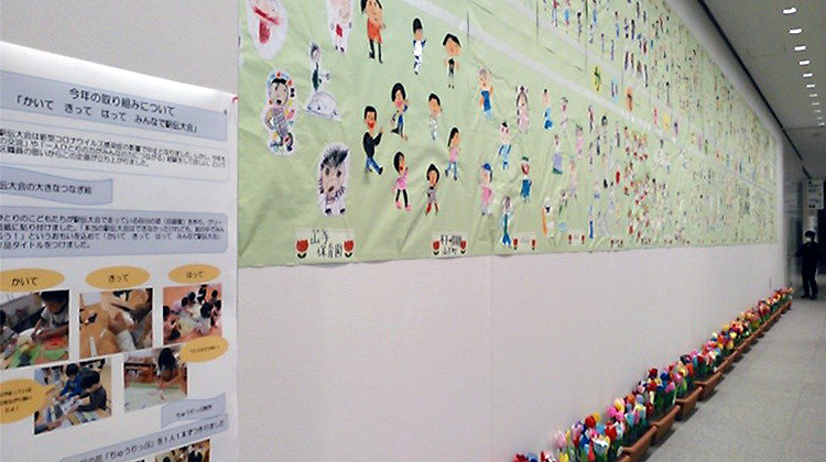 それに代わり、一人一人の子供たちが駅伝大会で走っている姿を描き、駅伝大会の様子を表現した作品を、手作りのチューリップとともに市庁舎に飾られています。知恵を使った素晴らしい取り組みに感動します。