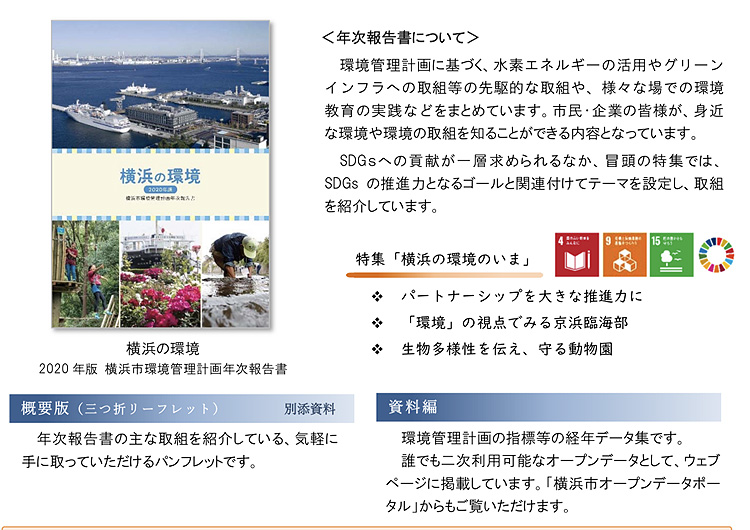 横浜市では、環境分野の総合計画として環境管理計画を策定しています。このたび、環境管理計画の2019年度の推進状況や横浜の環境の状況をまとめた「横浜の環境 ―2020年版横浜市環境管理計画年次報告書―」が公表されました。
