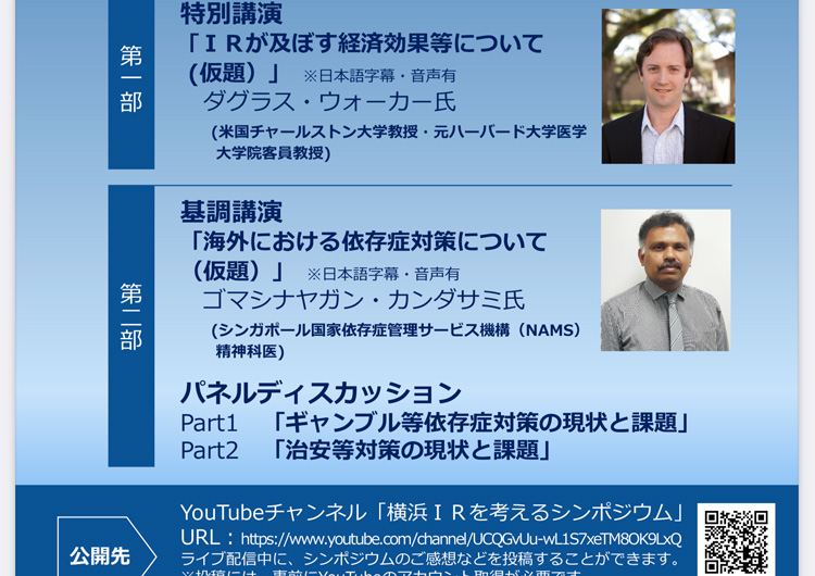 横浜市はIR(統合型リゾート)の誘致検討を進めていますが、カジノに起因するギャンブル等依存症や治安などについて、市民理解を深めて頂くための取組としてシンポジウムが開催されます。(12月20日、13時〜16時半)