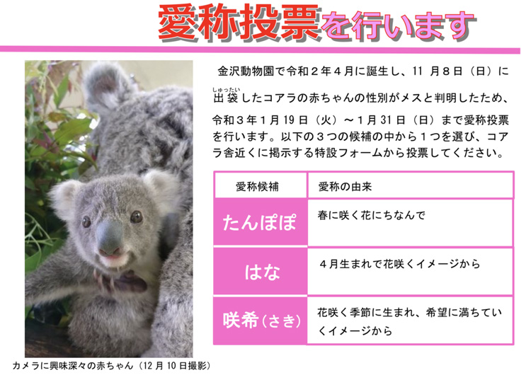 金沢動物園では、令和2年4月26日にコアラの赤ちゃんが誕生しました。今回、その赤ちゃんにつける愛称を投票で選ぶことになりました。金沢動物園内のコアラ舎付近の投票場所に掲示された二次元バーコード(QR コード)を、お手持ちのスマートフォンなどで読み込み、特設フォームより投票頂くことになります。(期間:令和3年1月19日から1月31日)
