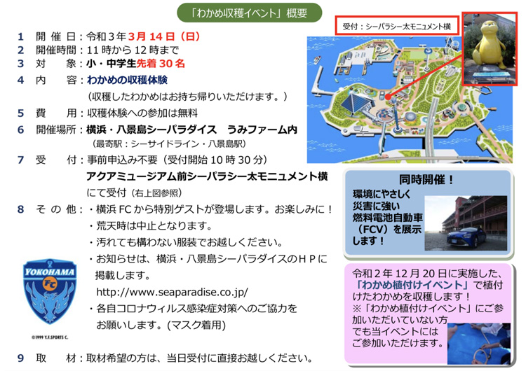 横浜市では、海洋資源を活用した温暖化対策プロジェクト「横浜ブルーカーボン」に平成23年度から取り組んでいますが、啓発の一環として、横浜・八景島シーパラダイスの“海育”施設「うみファーム」にて「わかめ」の収穫を体験できるイベントが開催されます。このイベントは、わかめの生育する様子や海洋生物が温室効果ガスを吸収することなどについて学ぶ機会となります。