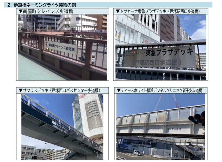 横浜市では、道路の維持管理財源を確保と、民間企業団体等の地域活動及び社会貢献の場を提供するために、市内の歩道橋を対象にネーミングライツ事業が行われています。