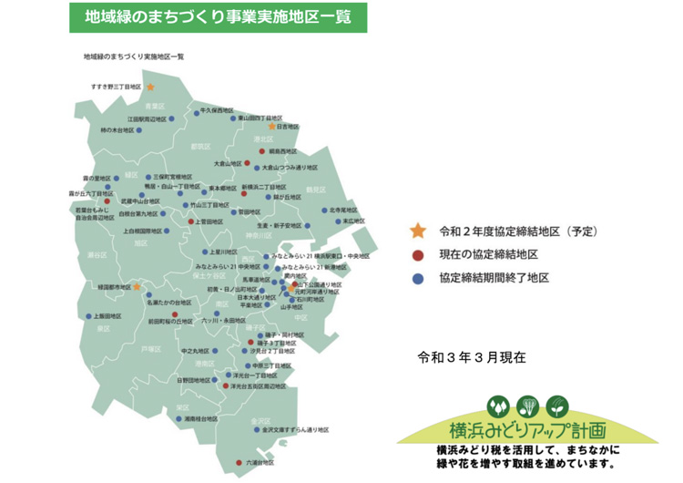 横浜市では「横浜みどりアップ計画」の取組の一つに、地域が主体となって、地域にふさわしい緑を創出する「地域緑のまちづくり」が、市民との協働で進められています。これまで市内の51地区において、地域、企業、学校、商店街など、多様な主体が連携しながら「市民が実感できる緑や花をつくる」と言った取組が実現されています。