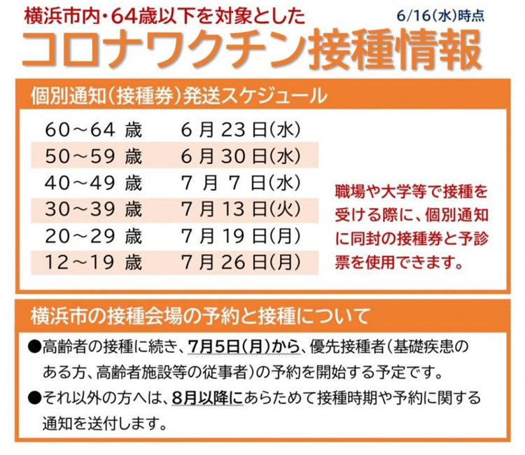 横浜市では、職域接種等への対応も踏まえ、64歳以下の市民への個別通知(対象者:約245万人)を順次送付する予定です。