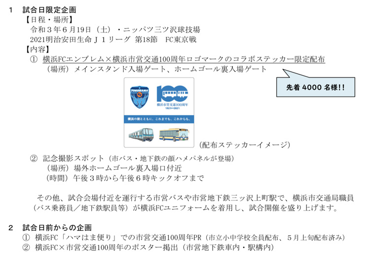 令和3年6月19日にニッパツ三ツ沢球技場で行われる試合を「市営交通100周年記念DAY」として、バス乗務員や地下鉄駅員が横浜FCユニフォームを着用すると共に、ポスター掲出などで盛り上げます。また当日の限定企画として、横浜市営交通100周年ロゴ入りコラボステッカーも配布される予定です。