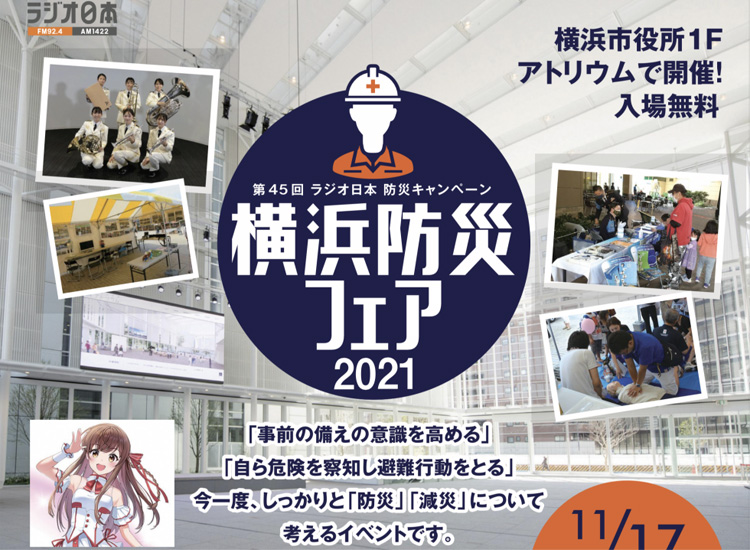 横浜市とラジオ日本の主催による「横浜防災フェア2021」が、令和3年11月17日(12時00分から19時30分)に、横浜市役所市のアトリウムで開催されます。多くの関連機関などから協賛・協力を頂き、今一度、しっかりと「防災・減災」について考えるイベントとなっています。