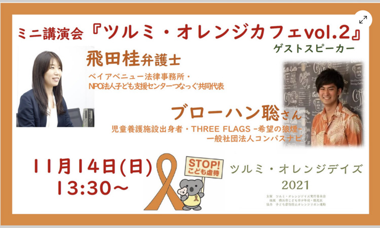 11月は児童虐待防止月間ですが、昨日は子ども虐待防止の第一線で活躍されている飛田桂弁護士と、当事者の立場から社会的擁護の啓発をしているブローハン聡さんによる講演会「ツルミ・オレンジカフェvol.2」に参加させて頂きました。