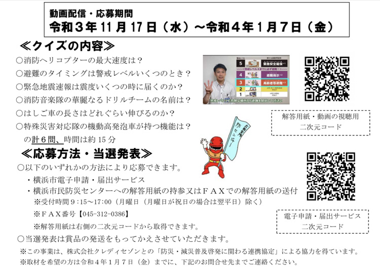 横浜市民防災センターでは、防災を学ぶツールとして、Youtubeによるクイズ動画の配信を開始しています。クイズに応募した方の中から抽選で10名の方に豪華賞品がプレゼントされます。
