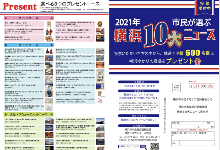 横浜市では、本年に横浜市内で起こった出来事や市政ニュースの中から、市民からの投票により「横浜10大ニュース」を決定します。 投票資格は市内在住の方(投票は一人1回に限り)で、投票期間は令和3年11月19日(金)〜12月10日(金)となっています。投票いただいた方の中から、抽選で合計600名様に横浜ゆかりのプレゼントが当たるとの事です。