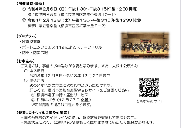 横浜市消防音楽隊では、令和4年2月6日及び12日に開催される定期公演の観覧者を募集しています。(12月27日まで)