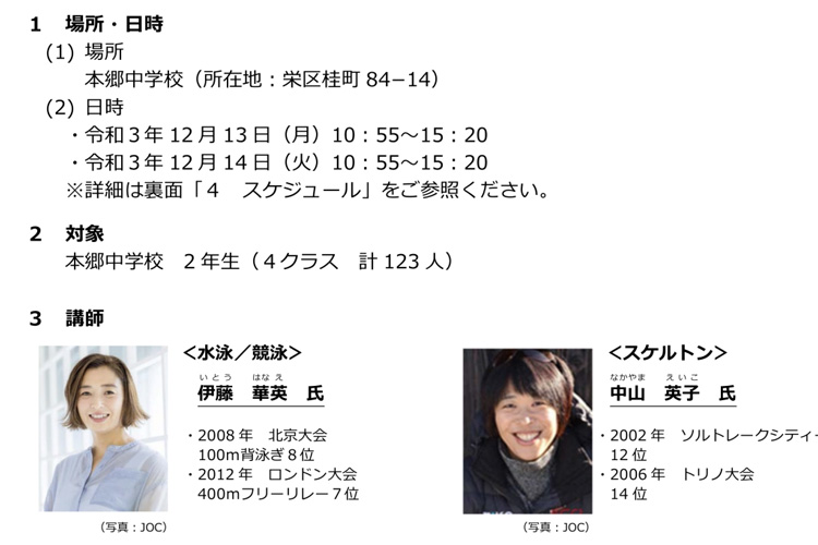 オリンピック・ムーブメントの普及・啓発活動の一環として、公益財団法人日本オリンピック委員会(JOC)が実施している「JOCオリンピック教室」が、令和3年12月13日と14日に渡り、横浜市立本郷中学校(栄区桂町84-14)で開催されます。