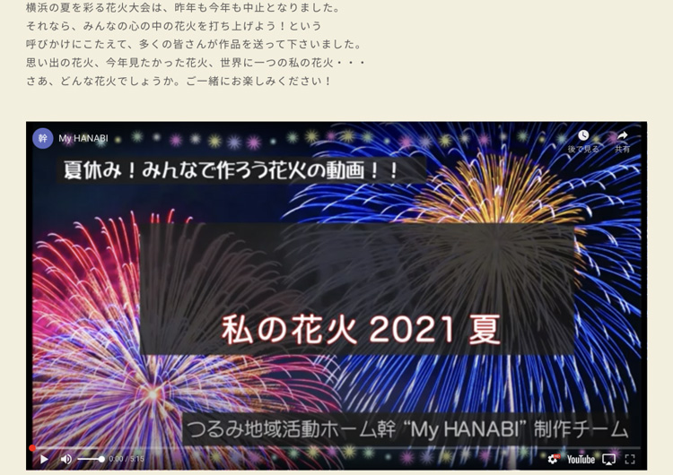 今年も花火大会が中止になったことから、施設の皆さんが花火の絵を描き、それを動画に仕立て「私の花火2021夏」を作成されたとの事です。個性あふれるたくさんの花火が登場しますが、