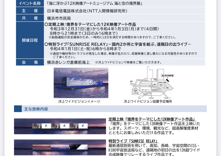 この度、新しい年に向けて「つながり」というメッセージを届けるため、NTT人間情報研究所との連携により「海に浮かぶ12K映像アートミュージアム〜海と空の境界展」が開催されます。令和3年12月31日から令和4年1月3日まで、赤レンガ倉庫前の海上に登場します。