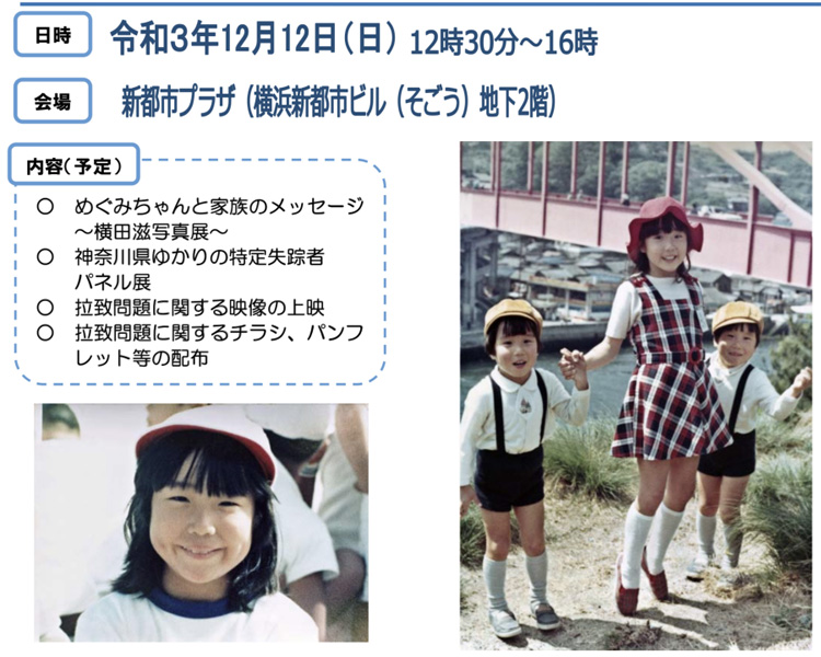このたび、横浜市・神奈川県の主催により、拉致被害者横田めぐみさん及び神奈川県ゆかりの特定失踪者の方々の写真展が開催されます。