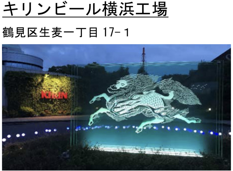 鶴見区からは、キリンビール横浜工場のサインが選ばれています。三層ガラスの装飾施工により、トレードマークの「麒麟」が夜間のライトアップで浮かび上がっています。