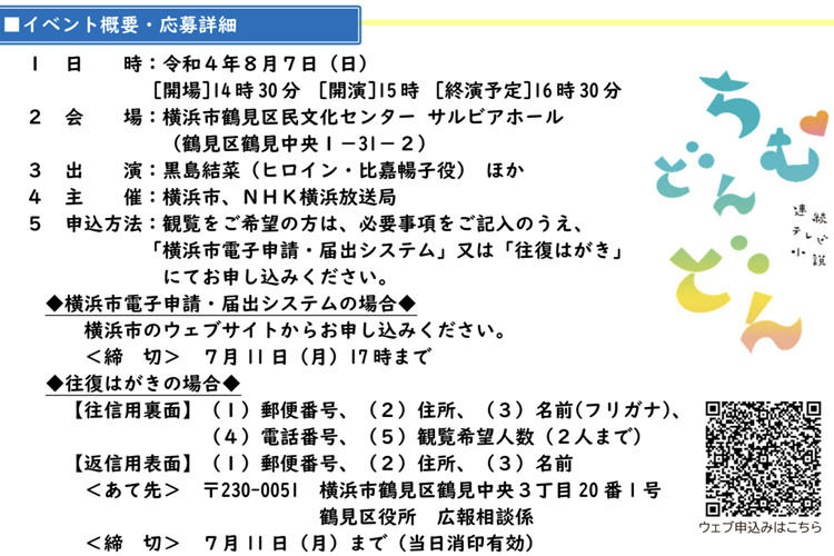 横浜市とNHK横浜放送局のコラボレーションにより、連続テレビ小説「ちむどんどん」のスペシャルトークショーが、ドラマ舞台の一つとなっている横浜鶴見にて開催されます。