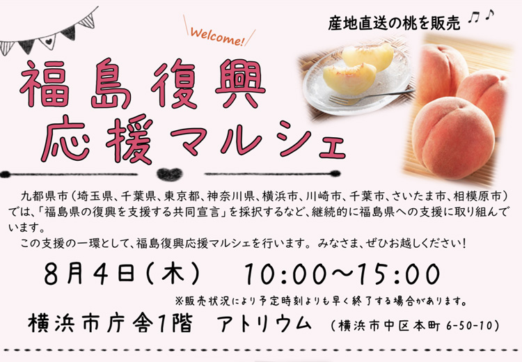 この支援の一環として、横浜市役所において「福島復興応援マルシェ」が開催されます。産地直送の桃をはじめ、福島の名産品等が販売される予定です。