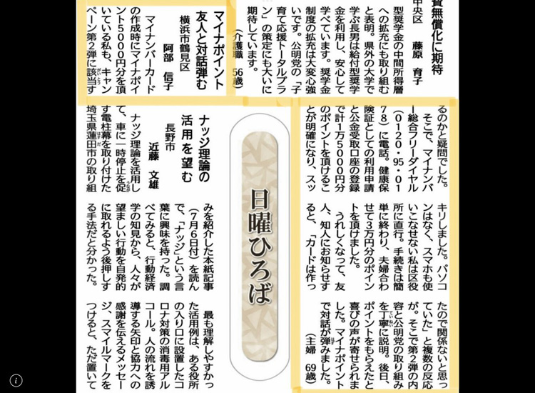 公明新聞の日曜ひろばに「マイナポイント」に関する投稿が掲載されていました。