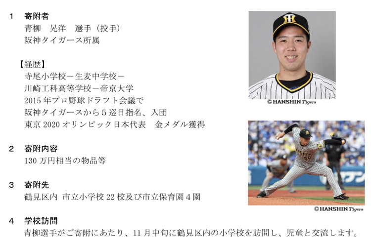鶴見区の出身で、現在、阪神タイガースでプロ野球選手として活躍されている青柳晃洋(あおやぎこうよう)選手から、鶴見区の子どもたちへの寄附に関する記者発表がありました。プロという厳しい世界で闘いながらも、地元を大切にされる青柳選手の心意気に感動します。