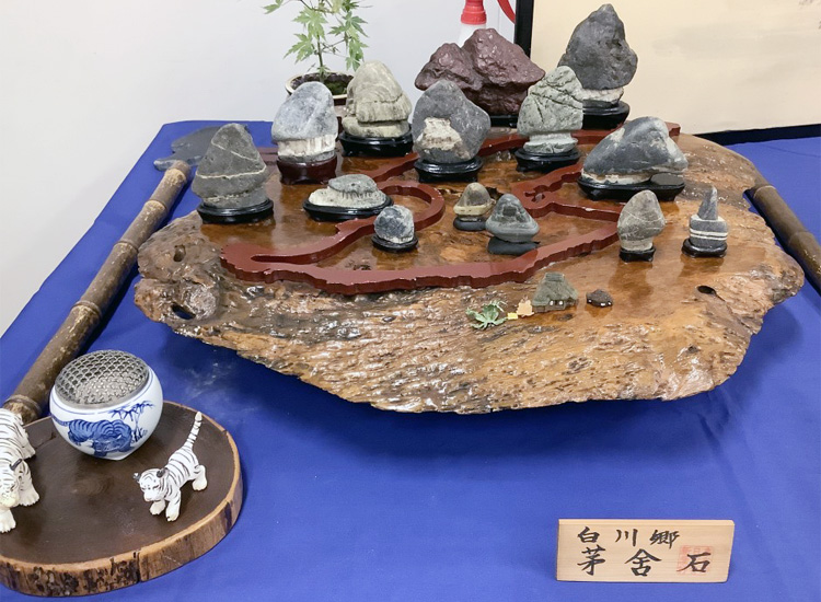 河原などで採取された石が、その形状を活かして、別世界を表現しています。さらに大きさの違う白い石粒で風景を描く盆石は、展示会場で4時間もかけて製作されているとの事です。