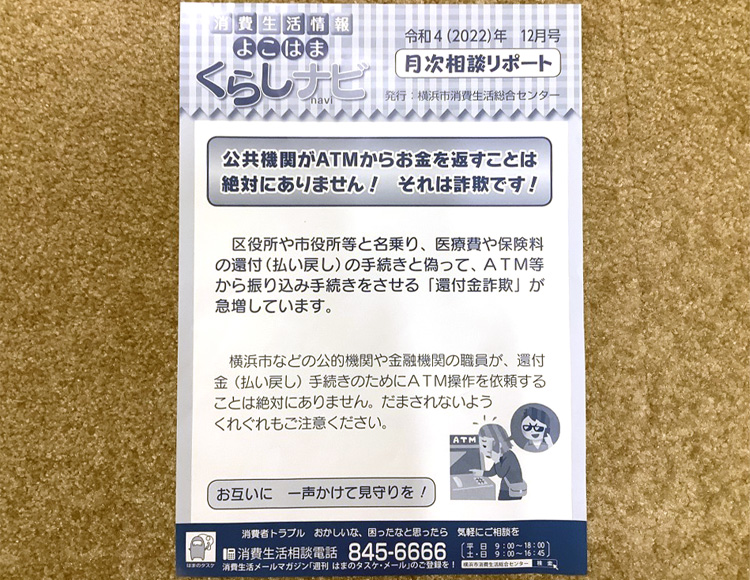 横浜市における特殊詐欺は、コロナ禍となった令和2年、3年は減少傾向でしたが、令和4年からは再び増加し、7月末時点での累計被害件数は分かっているだけで466件、被害額は約8億8100万円にのぼります。特殊詐欺被害者のほとんどが高齢者で、自分は絶対に騙されないと思っていた方が被害に遭われているようです。行政を名乗った還付金詐欺も急増しており、あわただしい年末年始も要注意です。
