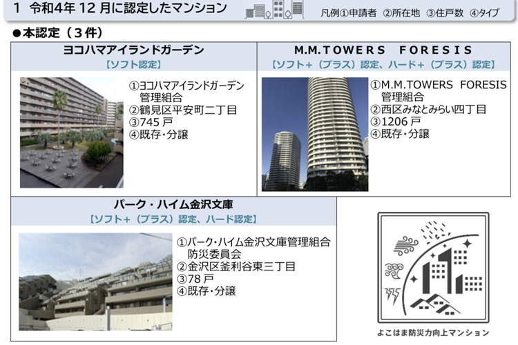 横浜市では、防災対策を実施しているマンションを「よこはま防災力向上マンション」として認定する制度を令和4年2月1日より開始しています。