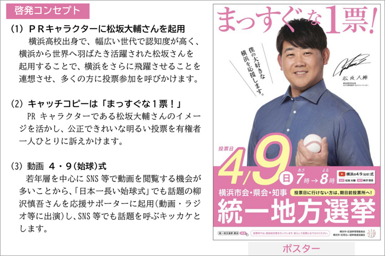 そこで4月9日に行われる統一地方選挙の認知度を高め、積極的な投票参加を推進するため、選挙PRキャラクターとして松坂大輔さんが、また応援サポーターとして柳沢慎吾さんが就任されます。
