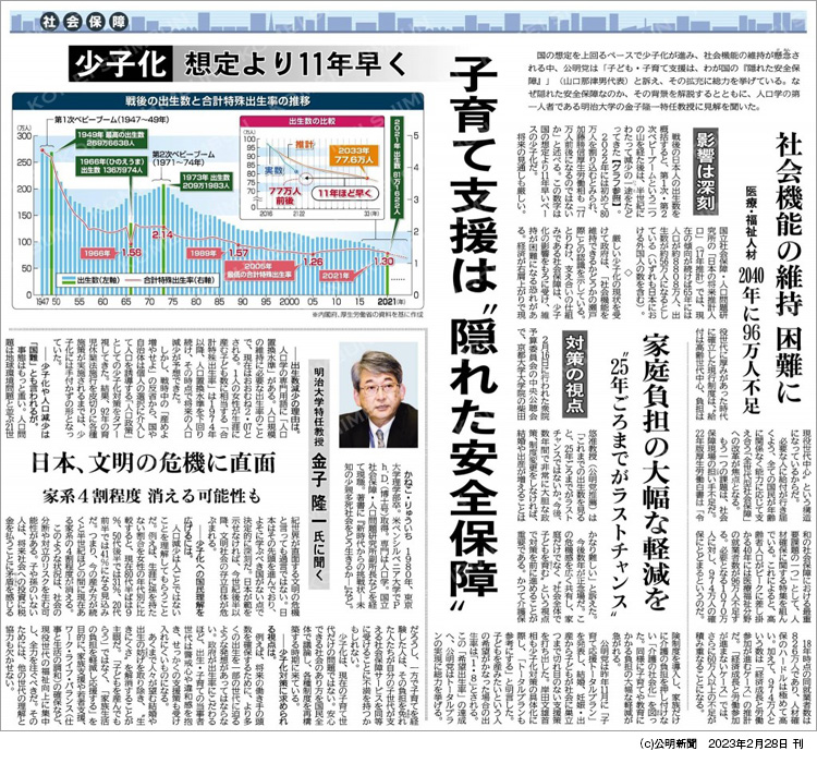 最近のマスコミ報道等では、少子化に関する内容が取り上げられています。2022年の出生率が80万人を割込み、国の推計からは11年も早く、これからの経済成長や社会保障の持続に大きな影響が出ると予測されています。