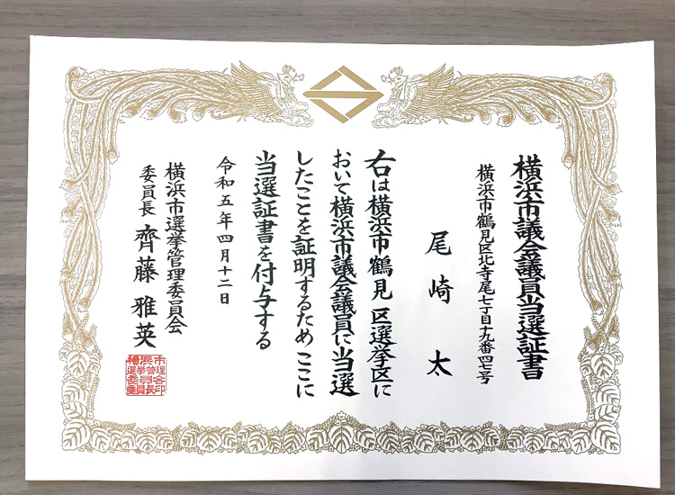 4月9日に行われた横浜市議会議員一般選挙の当選証書付与式が行われました。