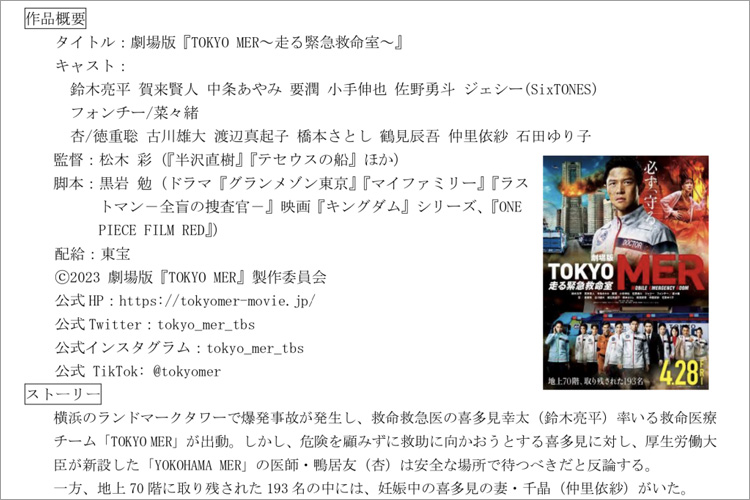 4月28日から公開される「TOKYO MER〜走る緊急救命室〜」は、横浜市のみなとみらいが舞台となっており、横浜フィルムコミッションによる撮影支援のほか、横浜市消防局も全面協力しています。