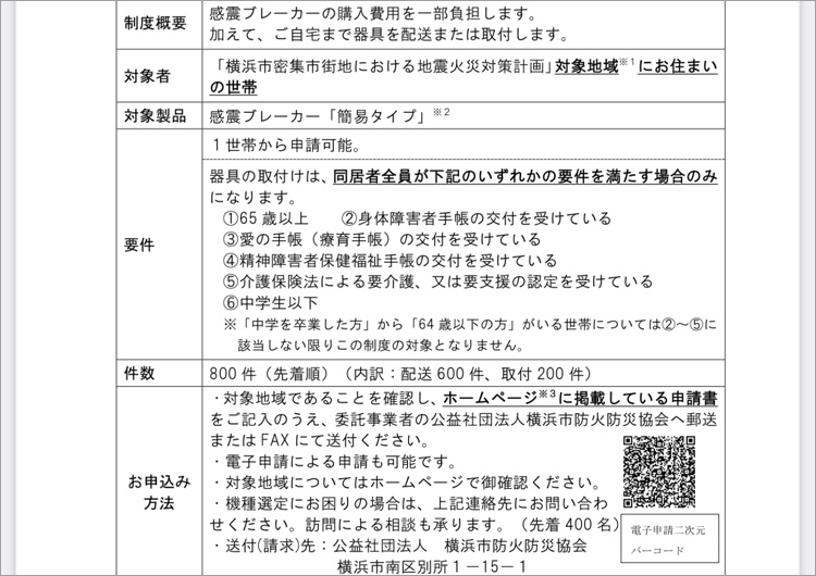 横浜市では「横浜市密集市街地における地震火災対策計画」対象地域にお住まいの方々を対象に、感震ブレーカー(簡易タイプ)の購入・取付支援を実施しています。