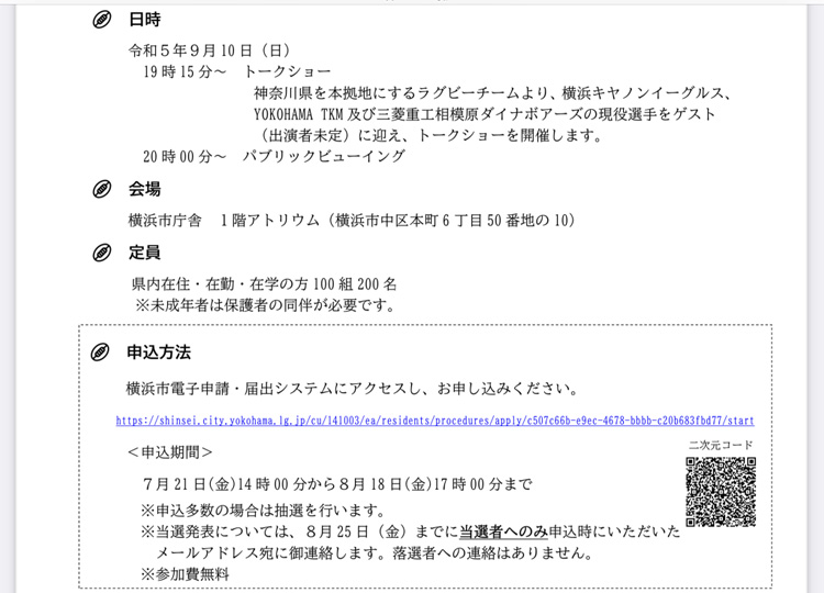横浜市では神奈川県と共催で、横浜市庁舎1階アトリウムにおいて「ラグビーワールドカップ2023フランス大会」のパブリックビューイング(日本代表対チリ代表)を開催します。