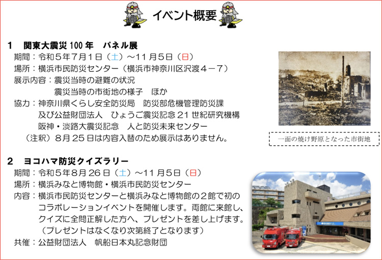 横浜市民防災センターでは、関東大震災から100年という節目にあたり、関係機関と連携した特別イベントが開催されます。過去の地震から防災の重要性や、必要な行動や備えなどを学んで頂く機会となります。