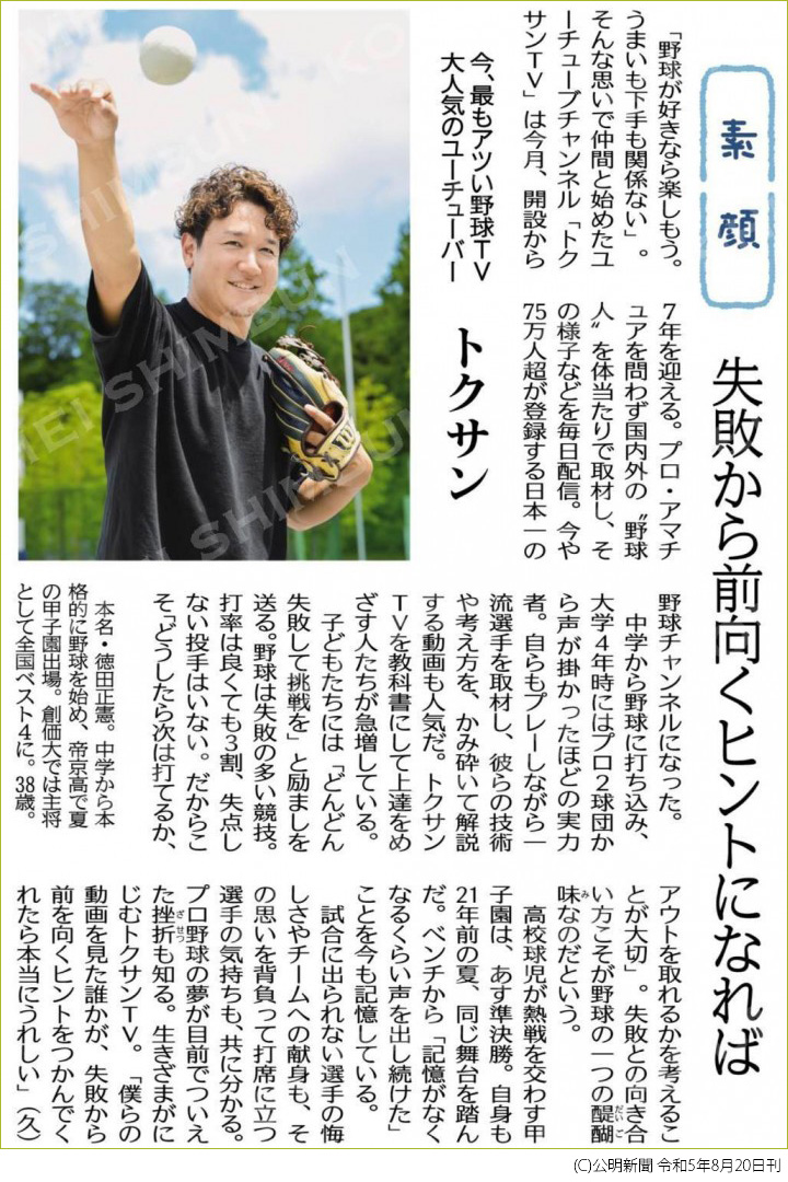 公明新聞の素顔のコーナーで、創価大学硬式野球部OBでユーチューバのトクサンが紹介されています。