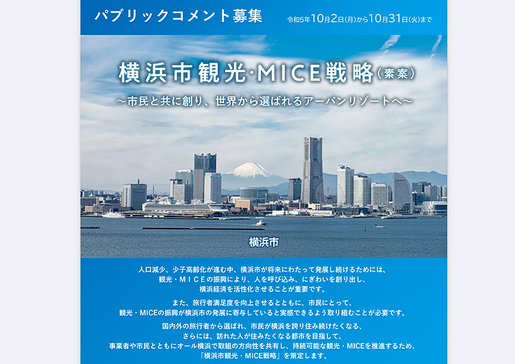 横浜市では持続可能な観光・MICEを推進するための計画策定を進めています。このたび「横浜市観光・MICE戦略」が取りまとめられ、市民の皆様からのパブリックコメントが実施されます。