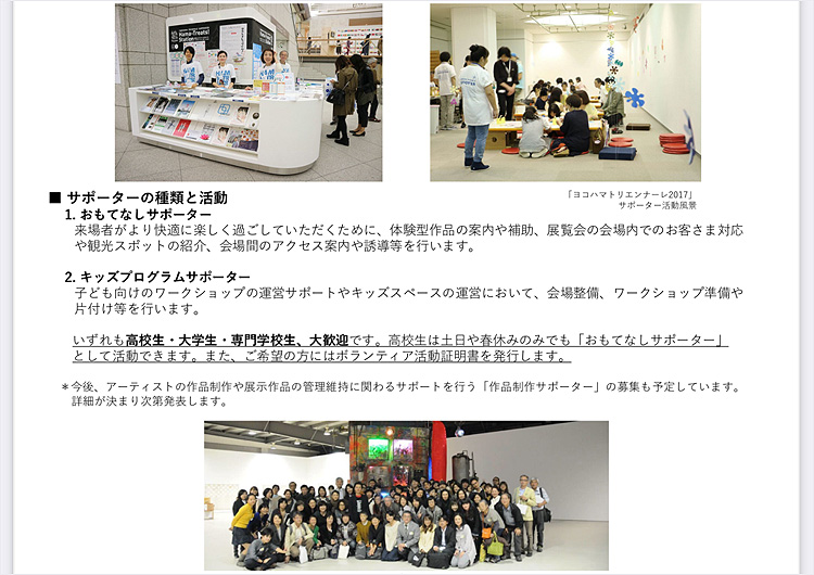 横浜トリエンナーレ組織委員会では、来年3月より横浜市で開催する現代アートの国際展「第8回横浜トリエンナーレ」(2024年3月15日〜6月9日)のサポーターを10月13日から募集しています。