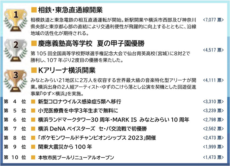 年末恒例、横浜市内で起こった出来事や市政ニュースについて投票いただく「横浜10大ニュース」の結果発表がありました。今年は過去最多となる10617人の市民の皆様から投票を頂いたものです。
