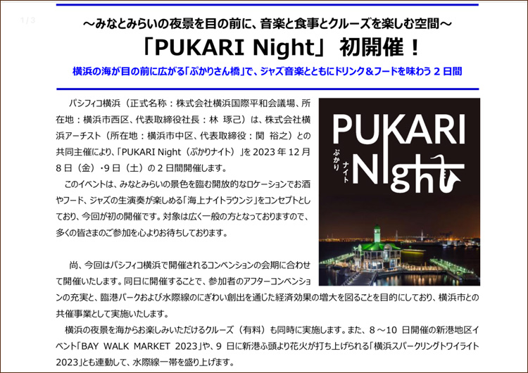 12月8日〜9日の2日間(16〜22時)、みなとみらいのぷかりさん橋において「PUKARI Night」が開催されます。