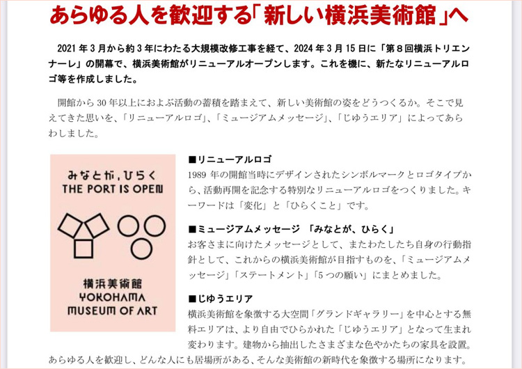 新たなリニューアルロゴも作成され、あらゆる人を歓迎する新しい横浜美術館が始まります。