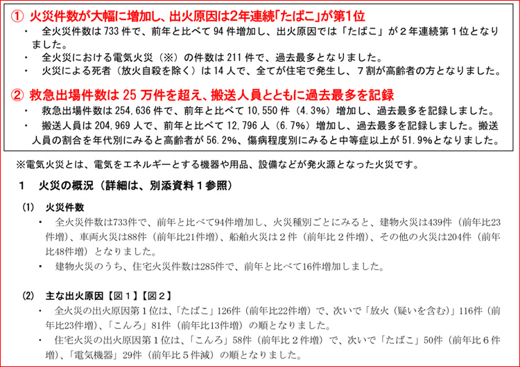 令和5年1月1日から12月31日までの「火災・救急概況」が公表されました。なかでも救急出場件数は254,636件(前年比10,550件増)で、過去最多を記録しています。1日あたりの平均救急出場件数は698件(前年比29件増)で、2分4秒に1回救急車が出場している計算となります。