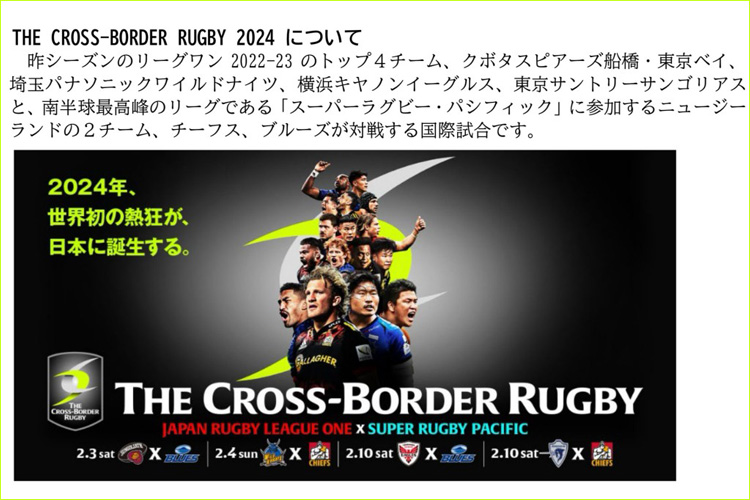 今回、THE CROSS-BORDER RUGBY 2024でのニュージーランドの強豪チーム「ブルーズ」との試合に、市内在住の小学生、中学生、高校生2000名が招待されます。