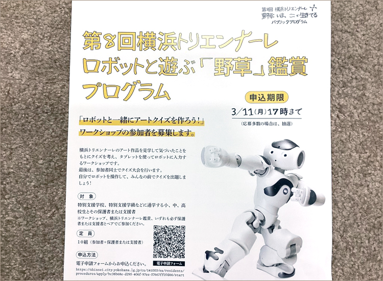 第8回横浜トリエンナーレでは、民間企業との共同で『ロボットと遊ぶ「野草」鑑賞プログラム』を2024年3月に実施する予定です。特別支援学校や特別支援学級などに通学する小・中・高校生がアート作品に触れ、ロボットを通して、様々なチャレンジを行うものです。申込期限は令和6年3月11日までとなります。