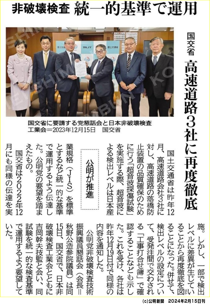 公明党と非破壊検査工業会では、統一的な基準での適切な非破壊検査の運用に向けて、国交省との協議が行われています。
