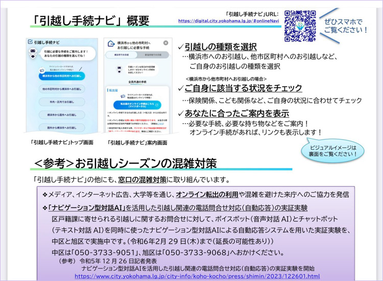 横浜市では、本格的な引越しシーズンに向けて、簡単なチェックにより必要な手続を診断できる「引越し手続ナビ」を、DXポータルサイト「横浜 DIGITAL窓口」上に開設しています。
