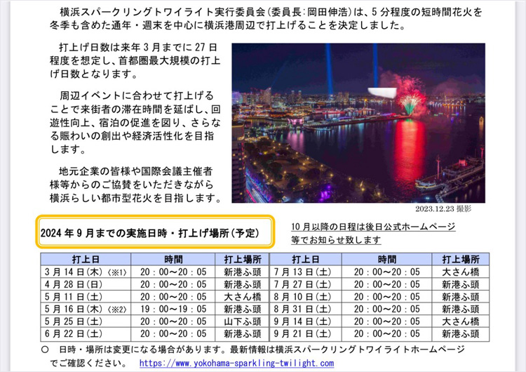 横浜スパークリングトワイライト(花火)の実施予定が発表されています。
