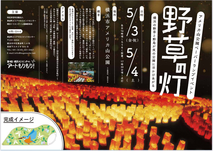 第8回横浜トリエンナーレでは、5月3日と4日に渡り、横浜市アメリカ山公園を会場に、ペーパーランプイベント「野草の灯」を開催します。ペーパーランプを並べてろうそくを灯し、アメリカ山公園の敷地いっぱいに「野草」にちなんだ地上絵が描かれます。