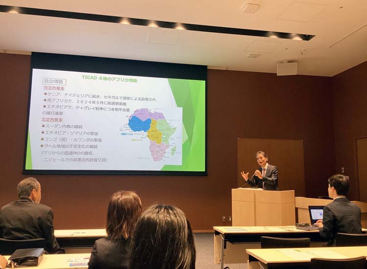 日本アフリカ友好横浜市会議員連盟では、外務省の清水TICAD担当大使を迎えて「最近のアフリカ情勢と今後の日アフリカ連携」とのテーマで講演会が開催されました。