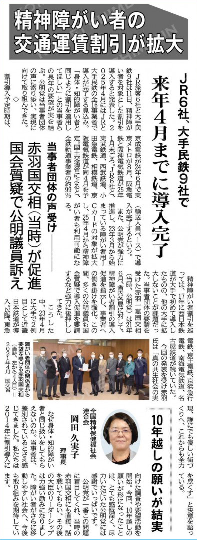 JRならびに民鉄9社では、身体・知的障がい者と同じく、精神障がい者への交通運賃割引が導入されます。(2025年4月までに完了予定)